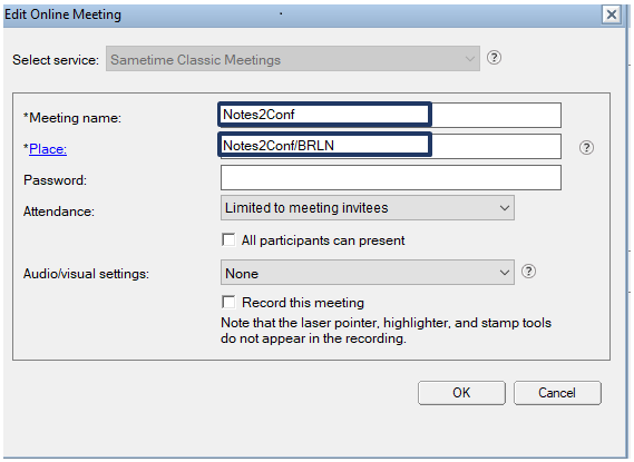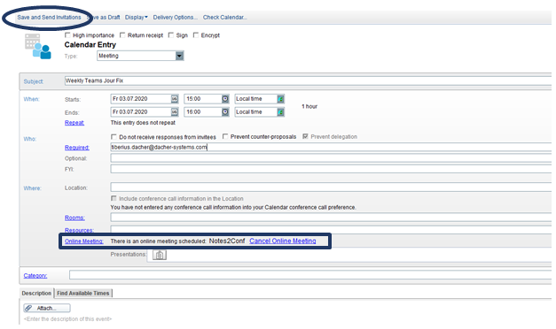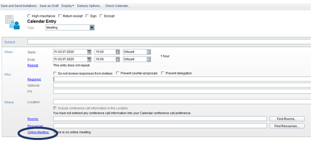 1. Start creating as usual a new meeting in your Notes Client Calendar. You will automatically be the Meeting Leader/Moderator.