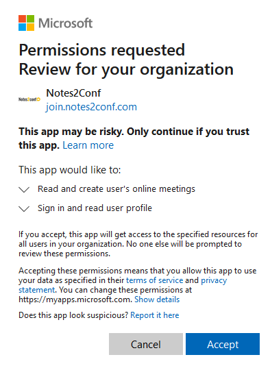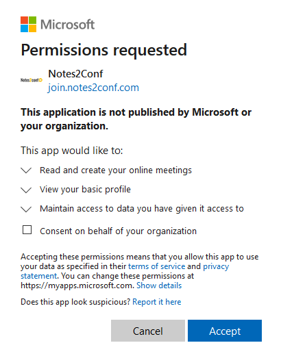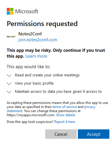 Microsoft will show a dialog with the required permissions for the Notes2conf app. Please click the "Accept" button to install the app for your account.