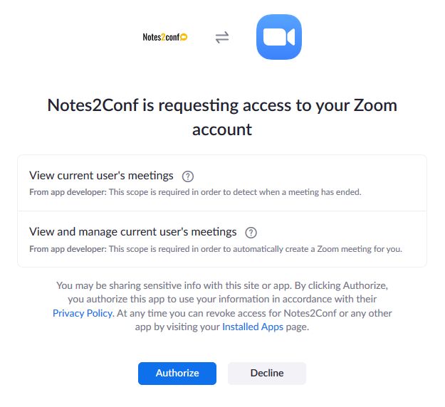 The first time you create a conference with Notes2conf you have to allow a few permissions requested by the Notes2conf app. The screen which requests the permissions is similar to the image below.